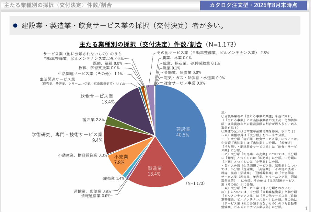 - 詳細な情報として、事務局分析資料の7~10ページに「業種別の採択された商品カテゴリ」についての分析が載っています。ご興味のある方は是非目を通してみてください。