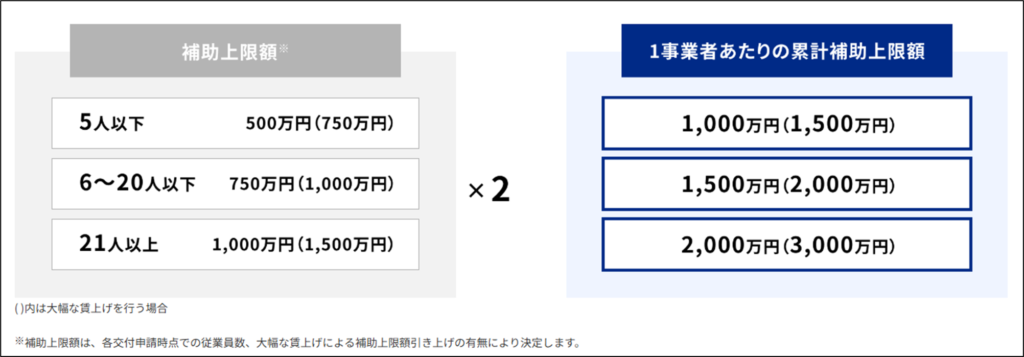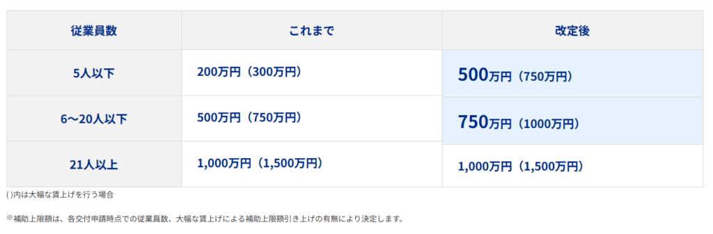 下表のとおり、従業員20人以下の事業者に対しほ補助上限額が大幅に引き上げられました!凄い引き上げ幅ですね!小規模事業者に対し、「もっもっと当補助金を活用してもらいたい」という政府意向の現れかと察します。