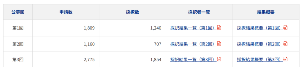 以下、1~3回の採択結果概要資料ですが、後半部分に8つの採択事例が掲載されていますので、ご関心のある方は是非目を通してみてください!