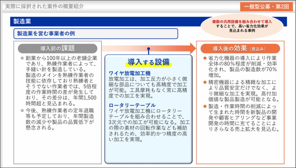 当補助金へ申請するためには「ICTやIoT、AI、ロボット、センサー等のデジタル技術を活用したオーダーメイドの専用設備を導入することが必要」と思われがちですが、導入する機械が全て(専用機器ではない)汎用機械であっても組み合わせて導入すれば補助対象となります。つまり、今までのものづくり補助金の一形態とも言えます。省力化・生産性向上を目的に、複数の汎用機械をつなぎ合わせる形態で導入すれば申請が可能です。以下、事務局が出している採択事例をご覧ください。