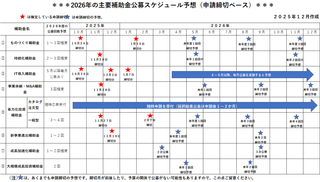 是非、以下の公募スケジュール予想を一つの目安として来年の補助金活用の参考にしてください。ただし、この公募スケジュールはあくまでも個人的な予想です。公募締切時期が変更になったり、予算の関係で公募回数が増減する可能性がありますので、この点ご留意ください。