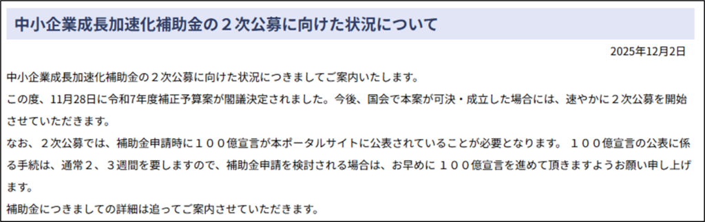今週、事務局HP(中小企業成長加速化補助金の2次公募に向けた状況について | 100億企業成長ポータル)に次回公募の状況について以下のアナウンスがありました。次回公募の締切は来年3~4月を予想します。