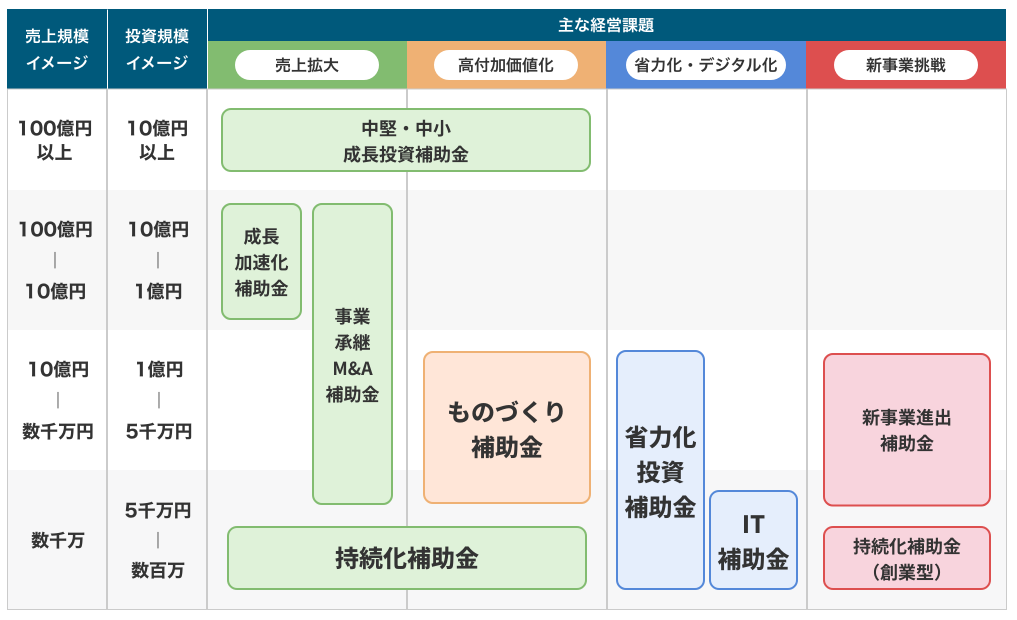 参考情報として、各主要補助金を経営課題と投資規模でマッピングした下図を貼り付けておきます。(ミラサポPlus掲載資料)