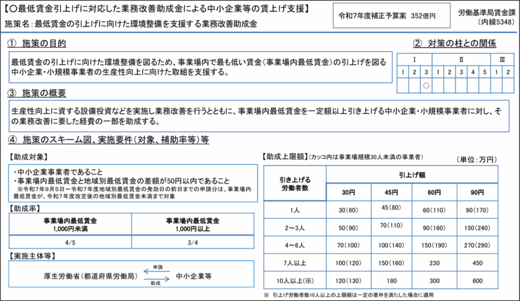 ただし、和歌山県独自の当助成金は、国(厚労省)の助成金のひとつである「業務改善助成金」に関連したもの、補完するものであることは容易に想像できます。業務改善助成金は当方の配信で何回も取り上げてきましたが、その概要は以下のとおりです。(厚労省令和7年度補正予算資料よりの抜粋)この助成金はあくまでも「生産性向上・業務改善に資する費用を助成」するものですが、助成対象となる費用としては(一般的な補助金では補助対象とならない)自動車、パソコン、プリンター、デジタル複合機等も対象となる使いやすい助成金です。